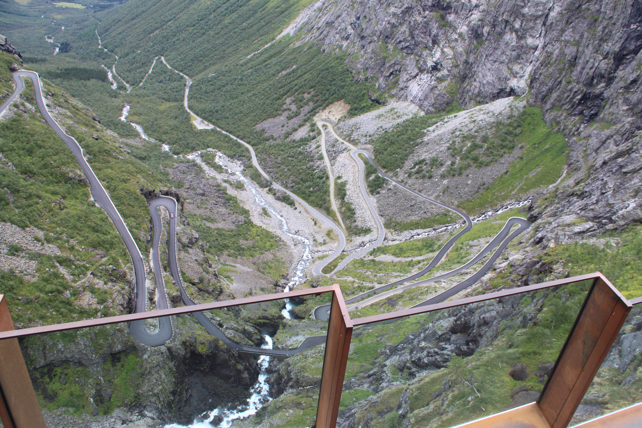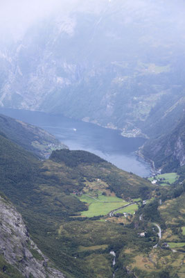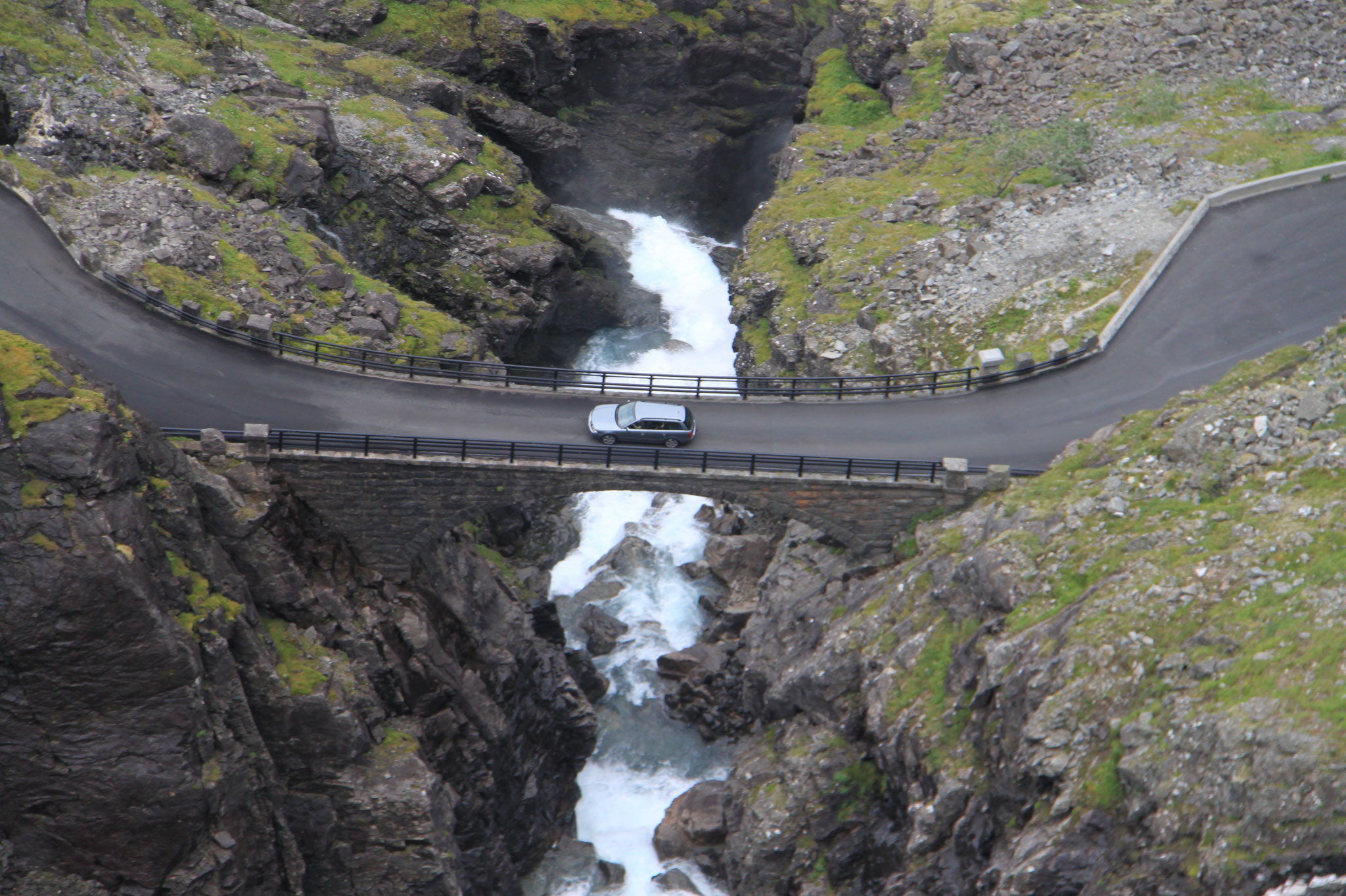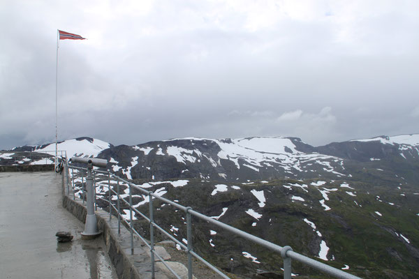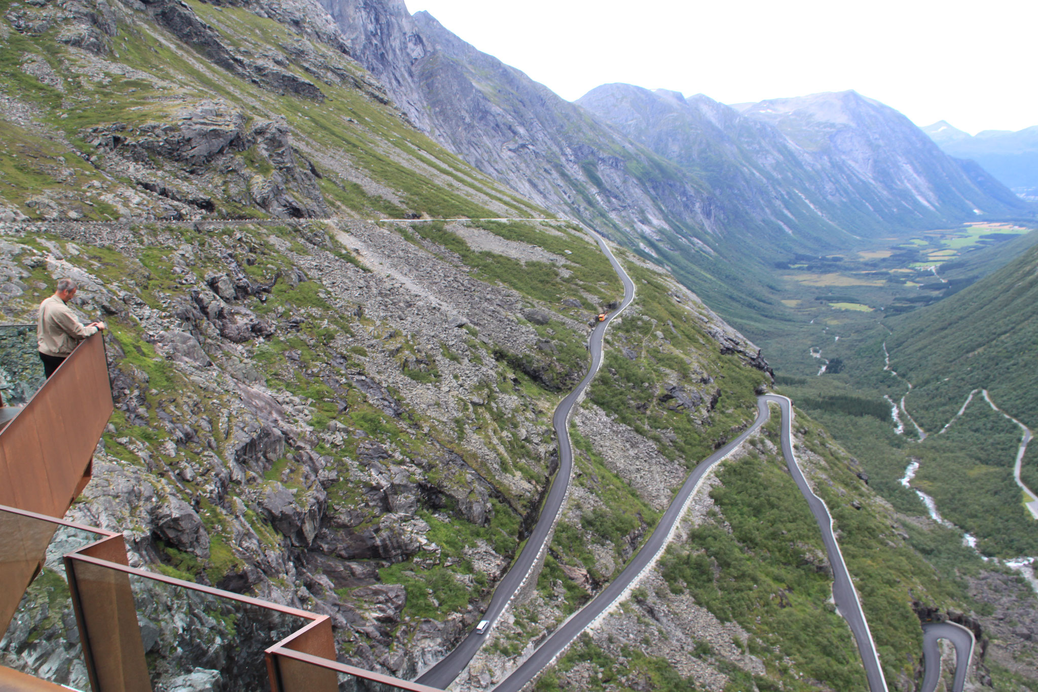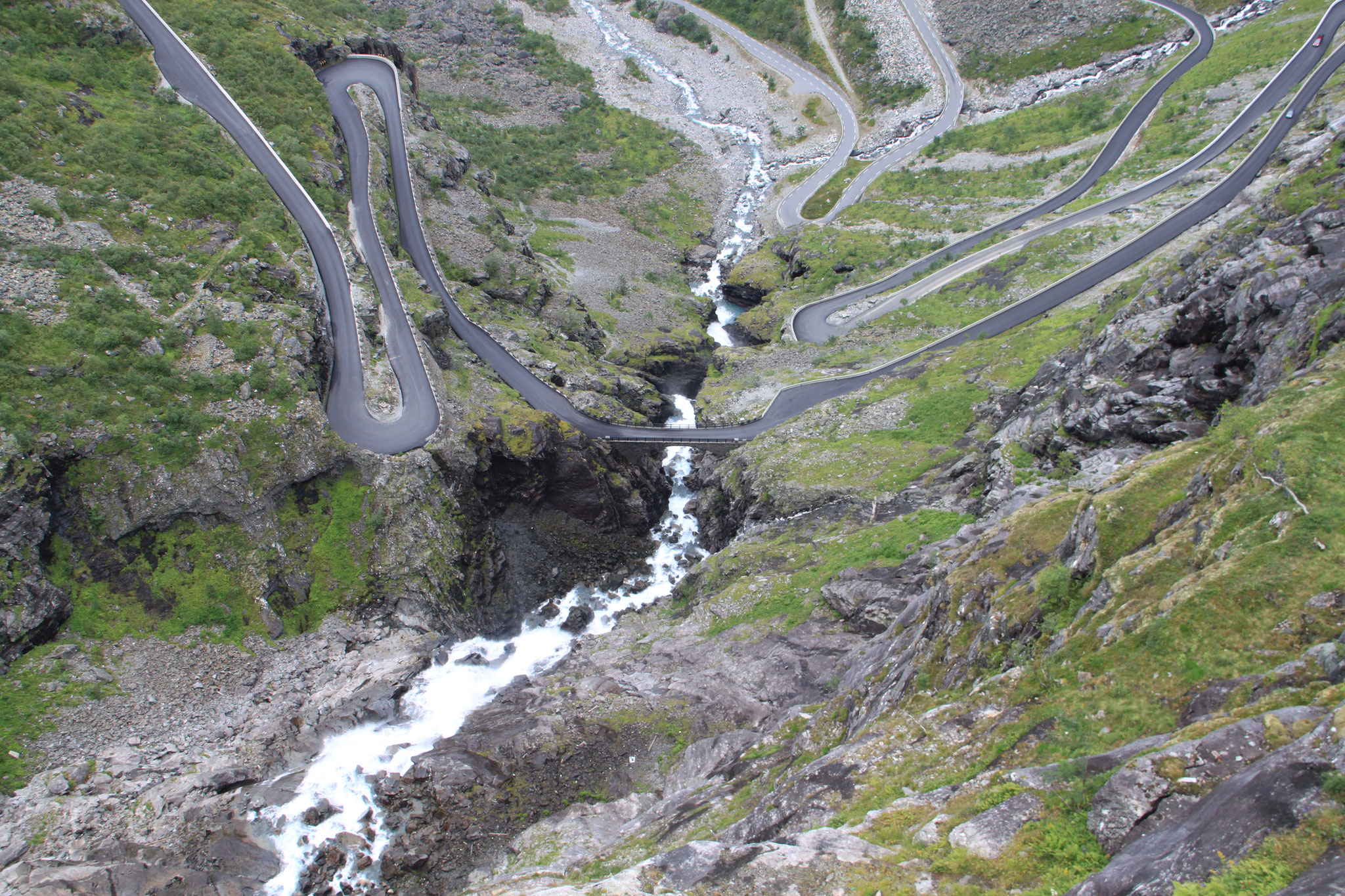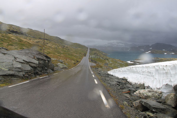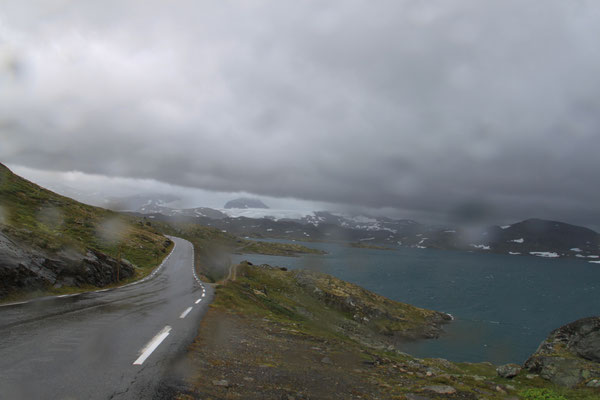 Jetzt geht es weiter zum Trollstigen. Der Trollstigen ist die Strasse nach Geiranger mit 11 Haarnadelkurven, steilen Schluchten und imposanten Aussichten. Auf halber Strecke zur Passhöhe führt eine Natursteinbrücke über den eindrucksvollen Stigfossen. Jede Haarnadelkurve trägt einen eigenen Namen. Die meisten Kurven sind nach dem Vorarbeiter des Arbeitstrupps benannt. Zum Teil ist die Fahrt hier ein richtiges Nevenkitzel. Hier haben wir auch einen Radfahrer getroffen, der auf dem Weg zum Nordkap war, er kam aus Ungarn.