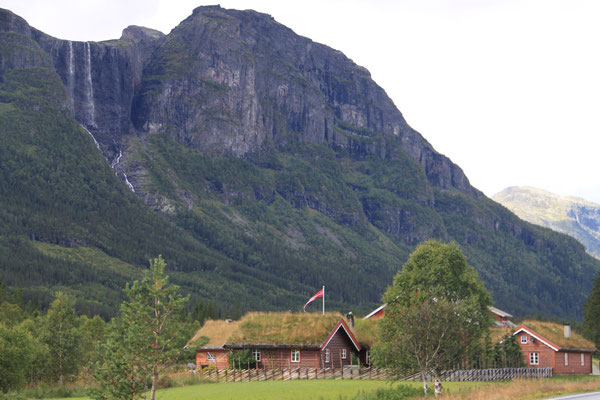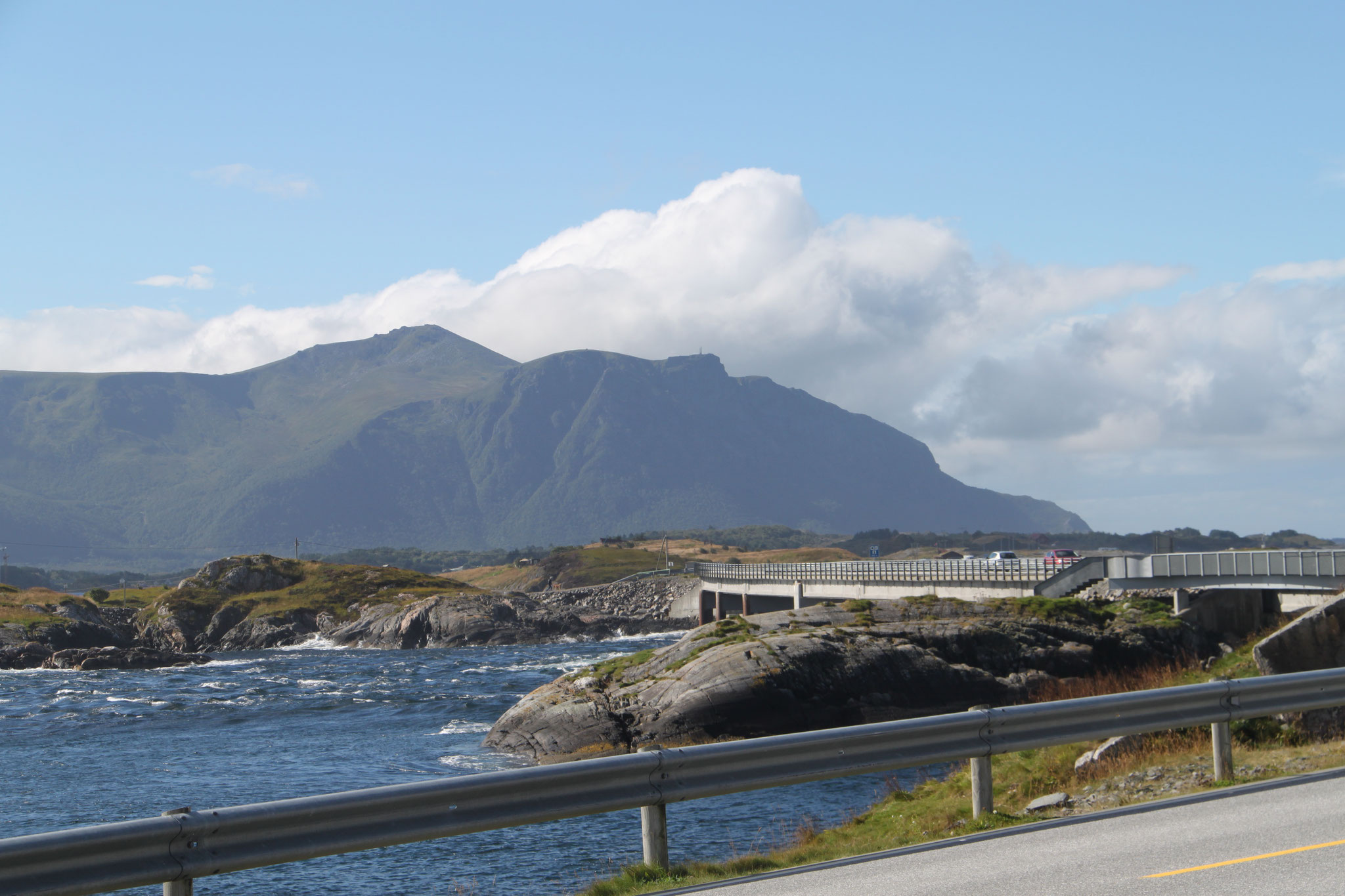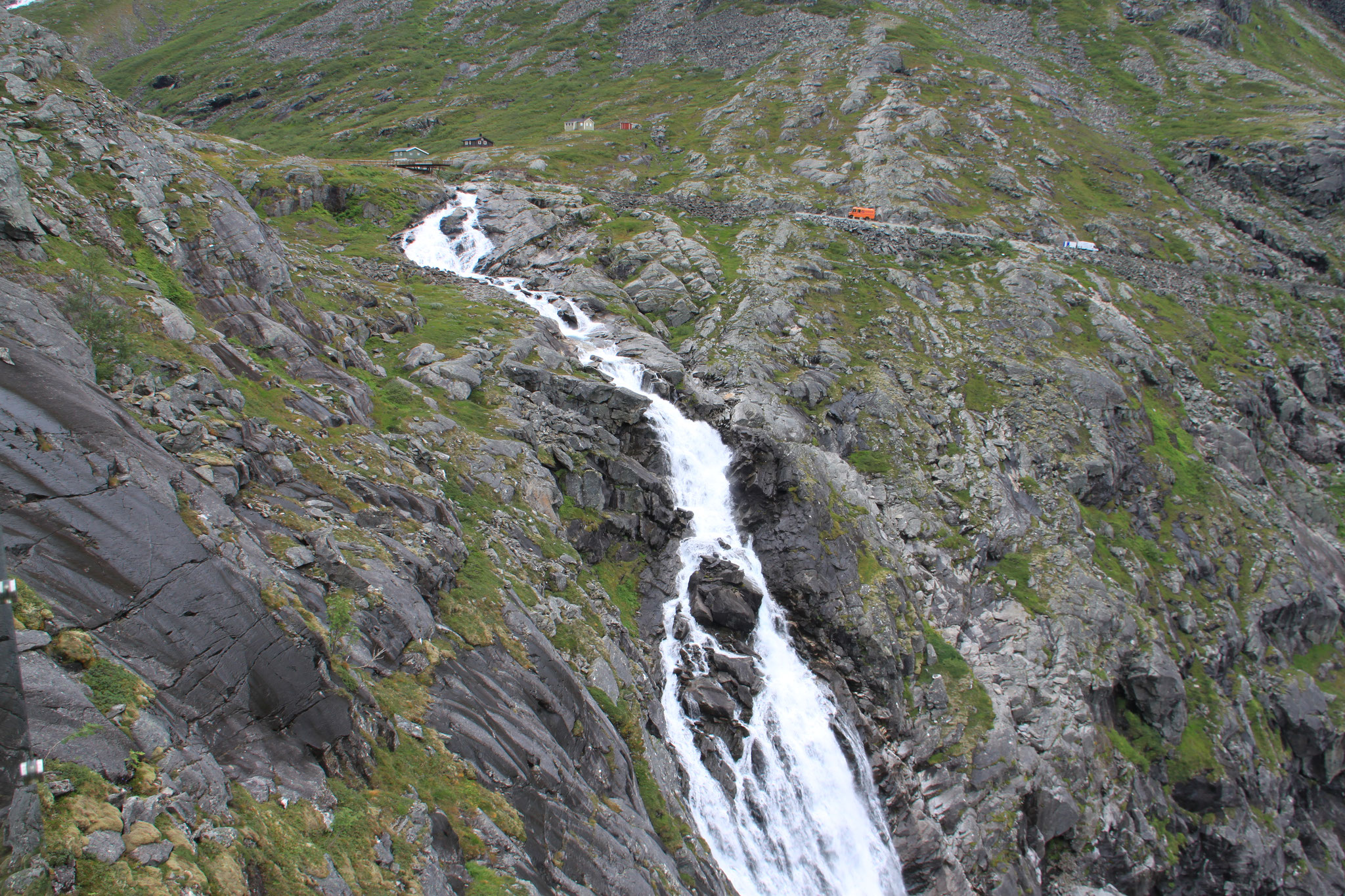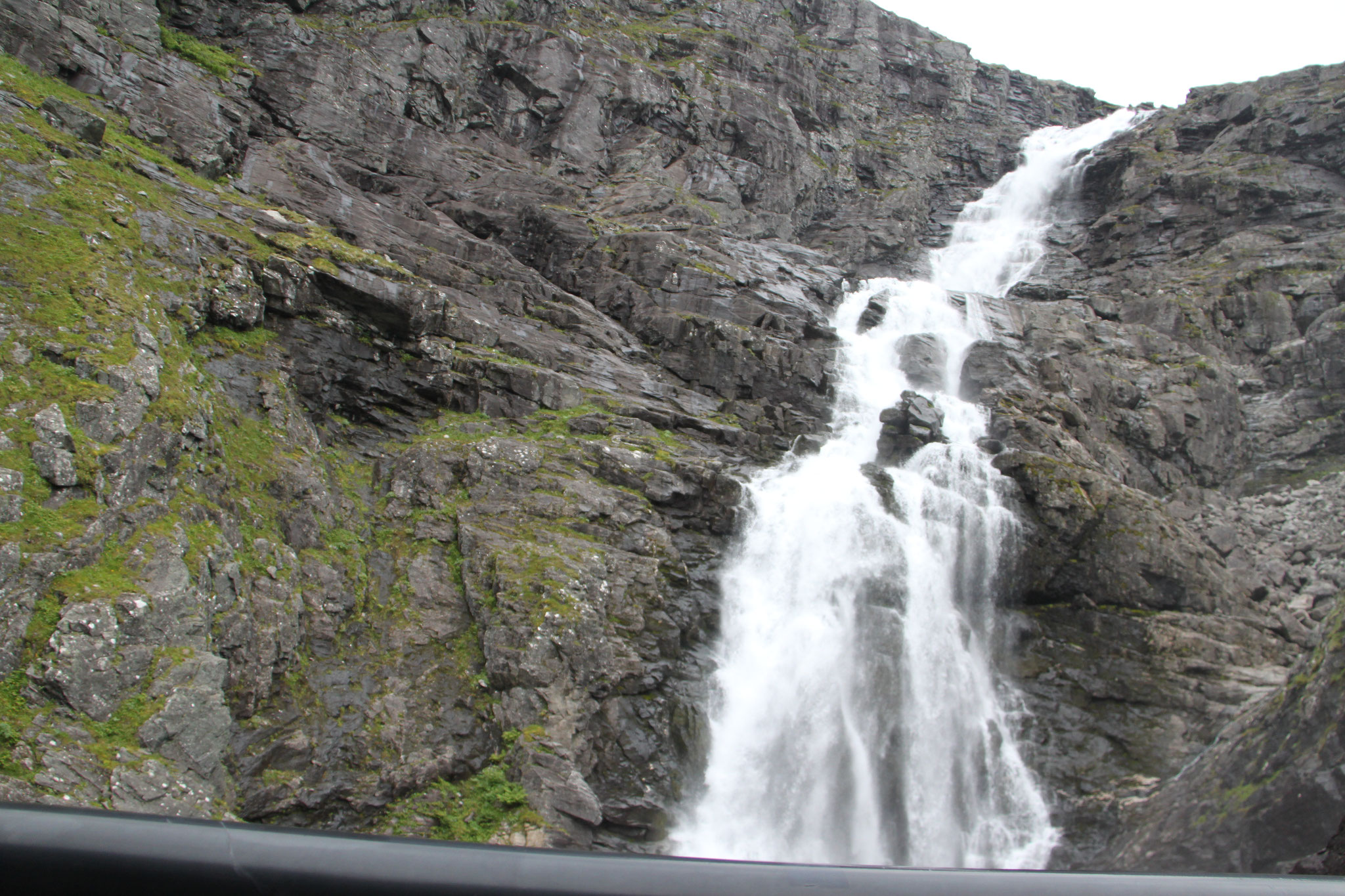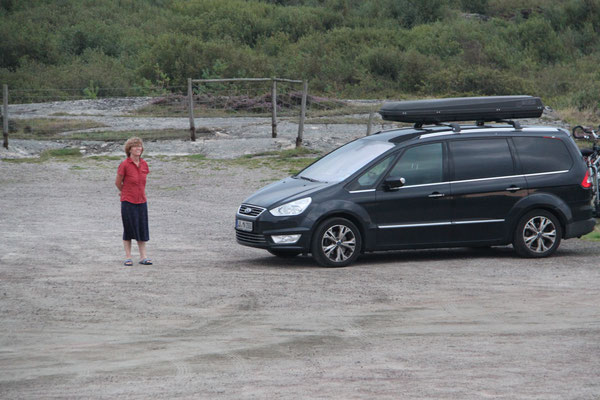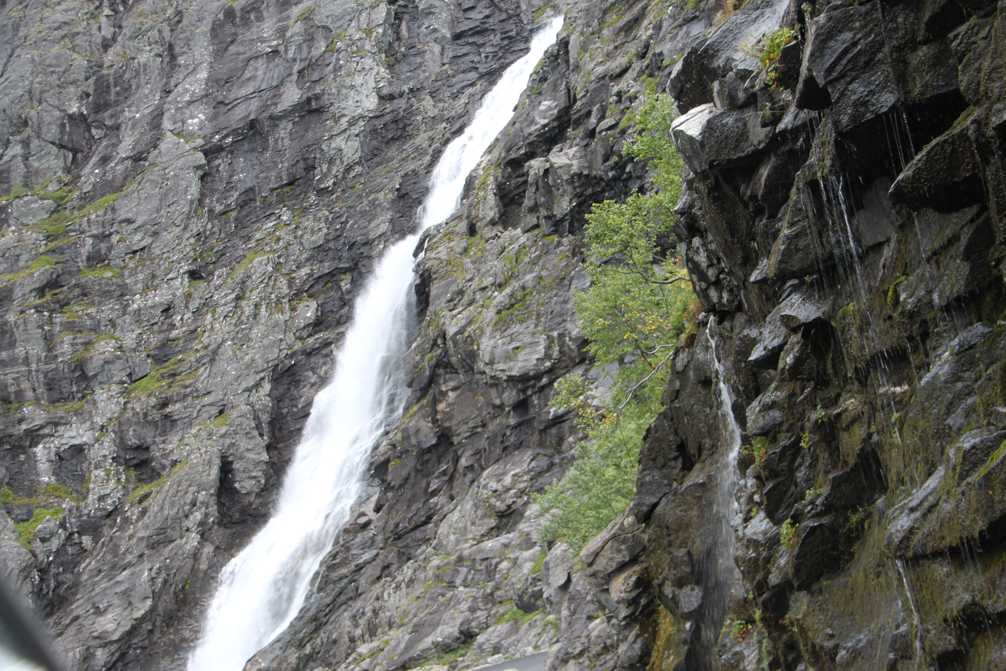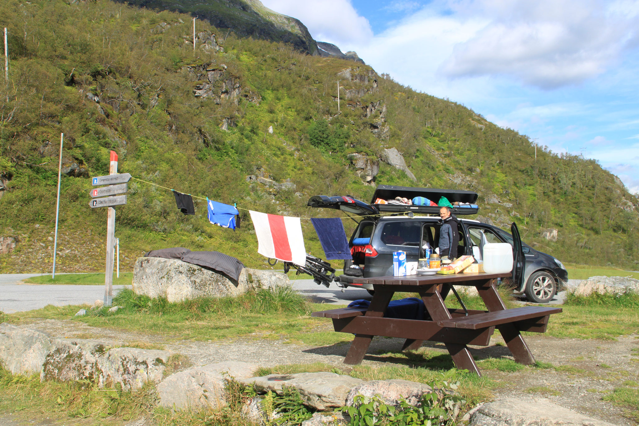Jetzt geht es weiter zum Trollstigen. Der Trollstigen ist die Strasse nach Geiranger mit 11 Haarnadelkurven, steilen Schluchten und imposanten Aussichten. Auf halber Strecke zur Passhöhe führt eine Natursteinbrücke über den eindrucksvollen Stigfossen. Jede Haarnadelkurve trägt einen eigenen Namen. Die meisten Kurven sind nach dem Vorarbeiter des Arbeitstrupps benannt. Zum Teil ist die Fahrt hier ein richtiges Nevenkitzel. Hier haben wir auch einen Radfahrer getroffen, der auf dem Weg zum Nordkap war, er kam aus Ungarn.