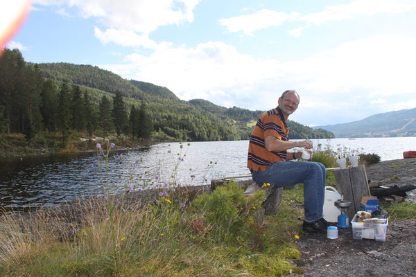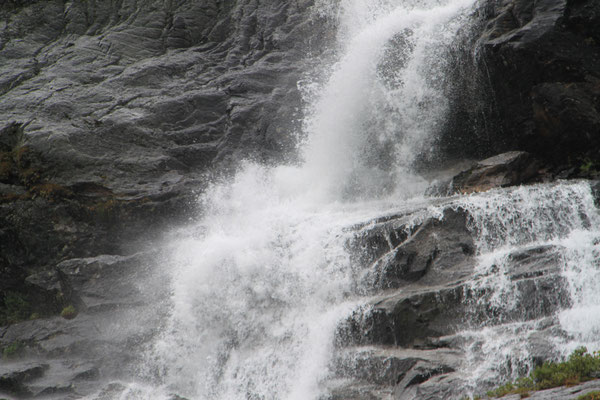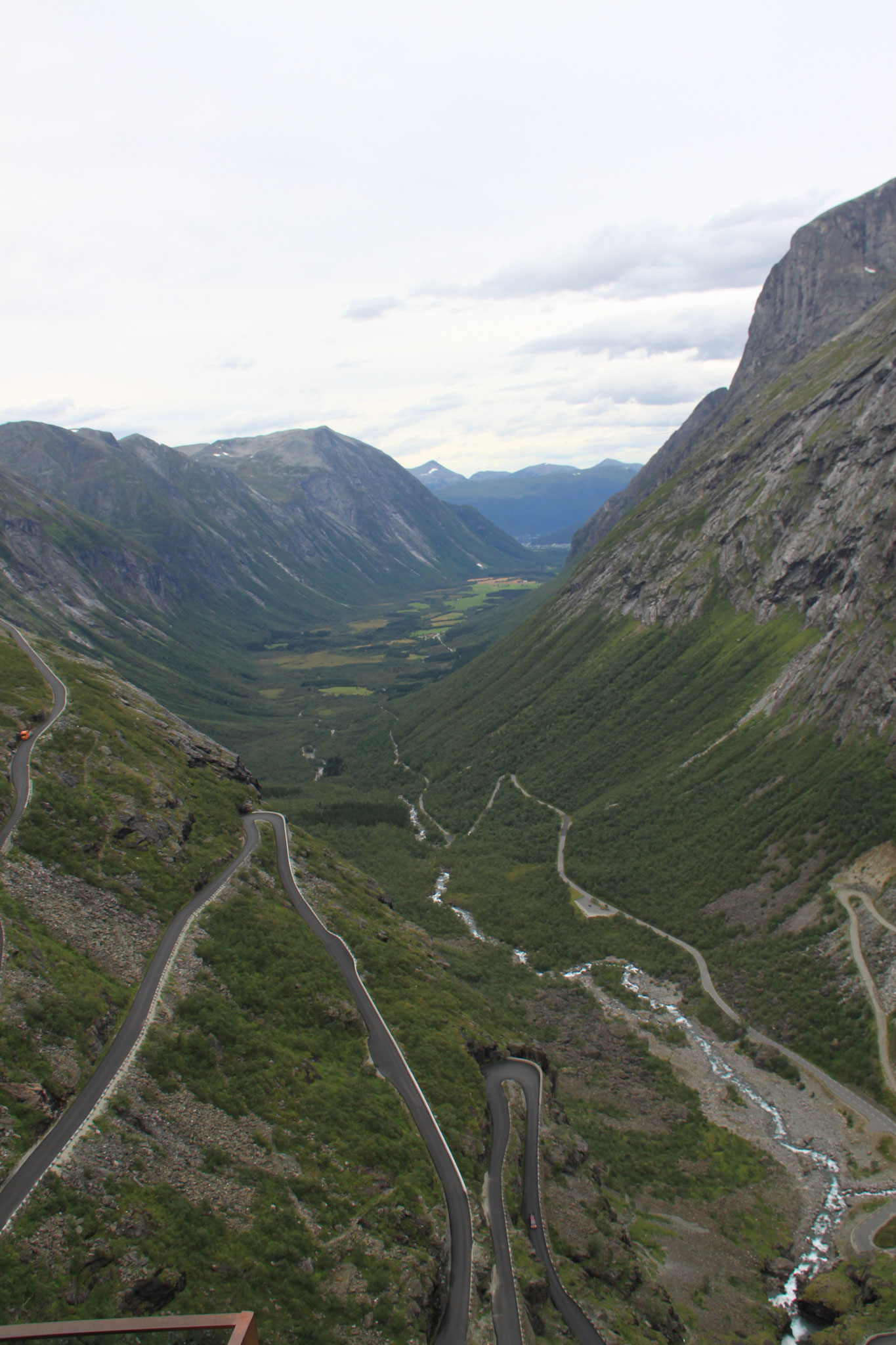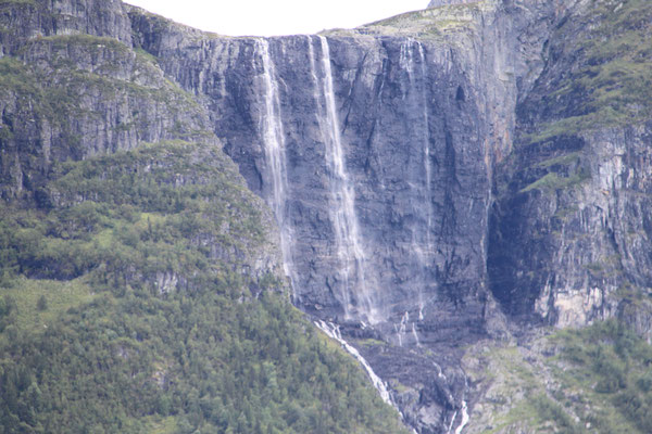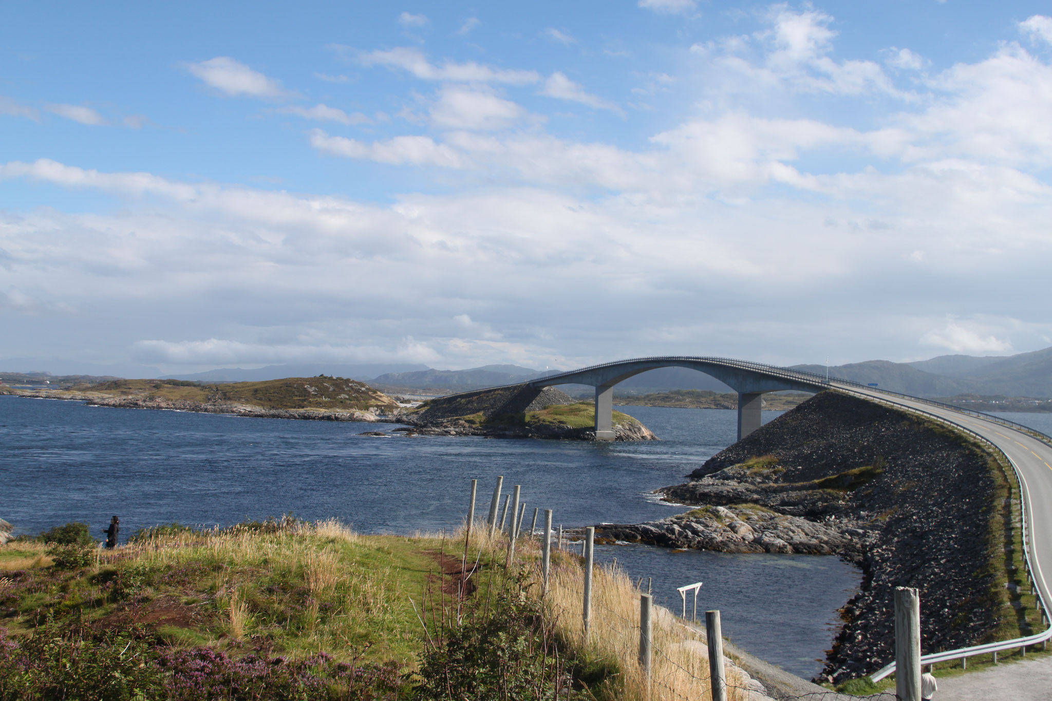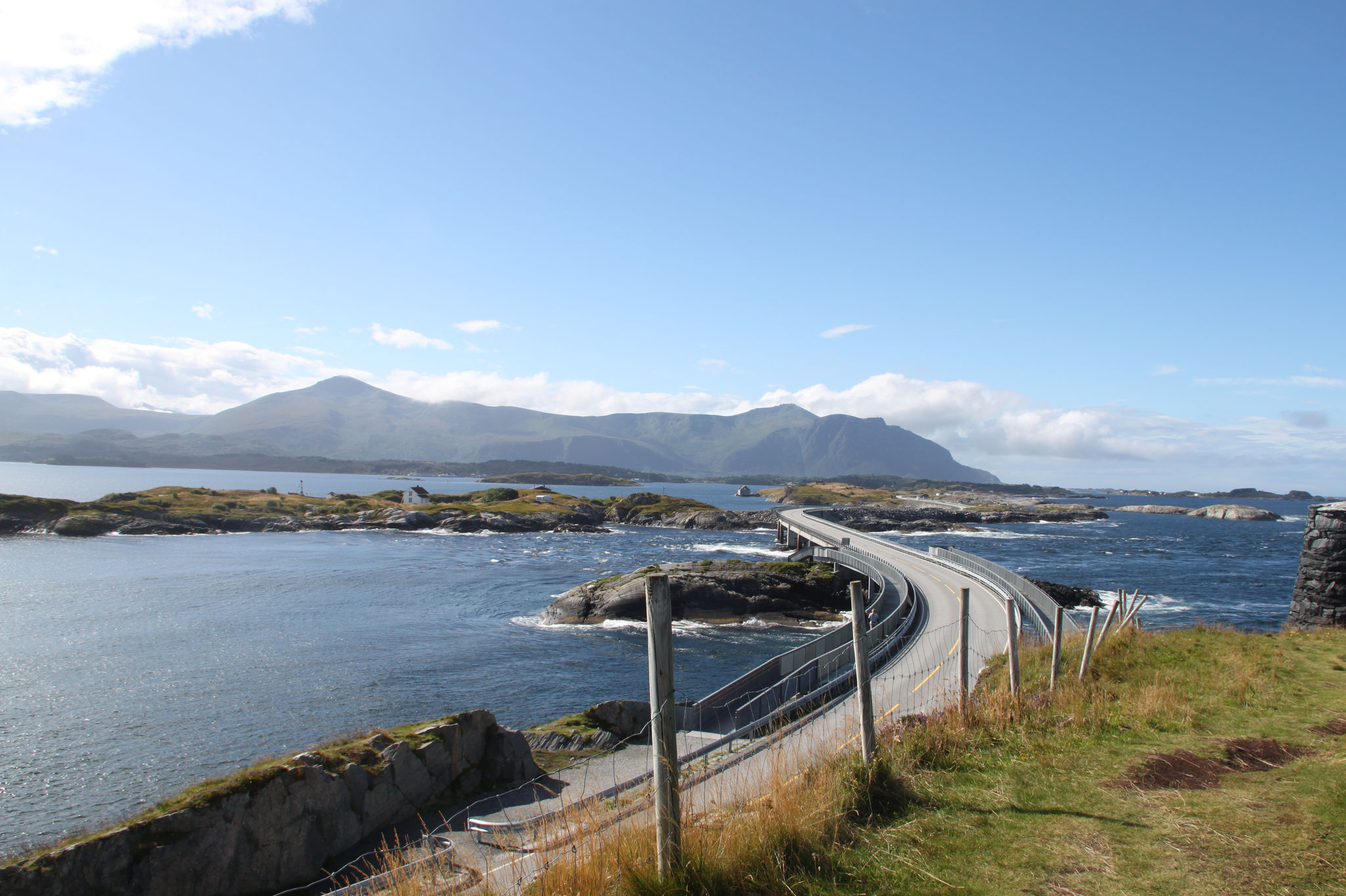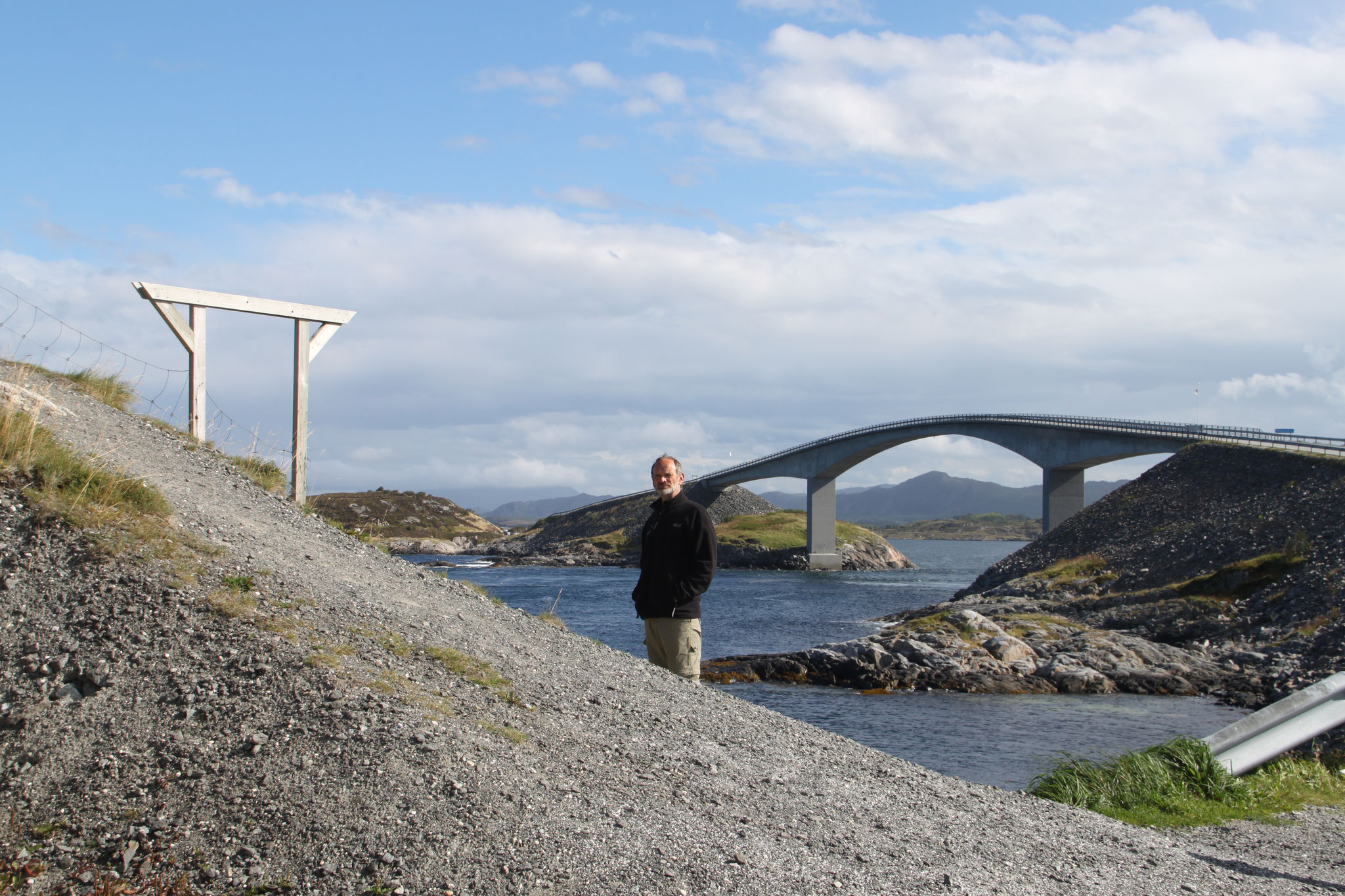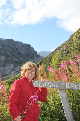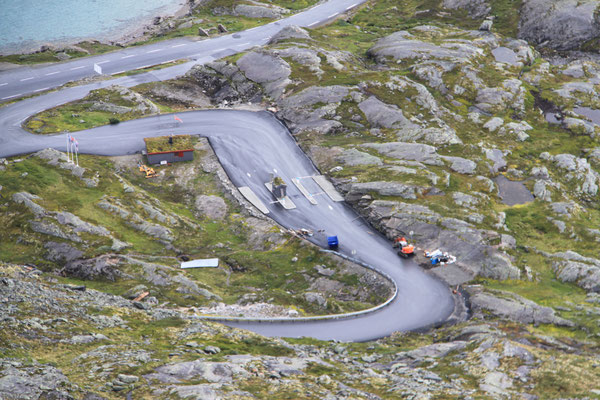 Jetzt geht es weiter zum Trollstigen. Der Trollstigen ist die Strasse nach Geiranger mit 11 Haarnadelkurven, steilen Schluchten und imposanten Aussichten. Auf halber Strecke zur Passhöhe führt eine Natursteinbrücke über den eindrucksvollen Stigfossen. Jede Haarnadelkurve trägt einen eigenen Namen. Die meisten Kurven sind nach dem Vorarbeiter des Arbeitstrupps benannt. Zum Teil ist die Fahrt hier ein richtiges Nevenkitzel. Hier haben wir auch einen Radfahrer getroffen, der auf dem Weg zum Nordkap war, er kam aus Ungarn.