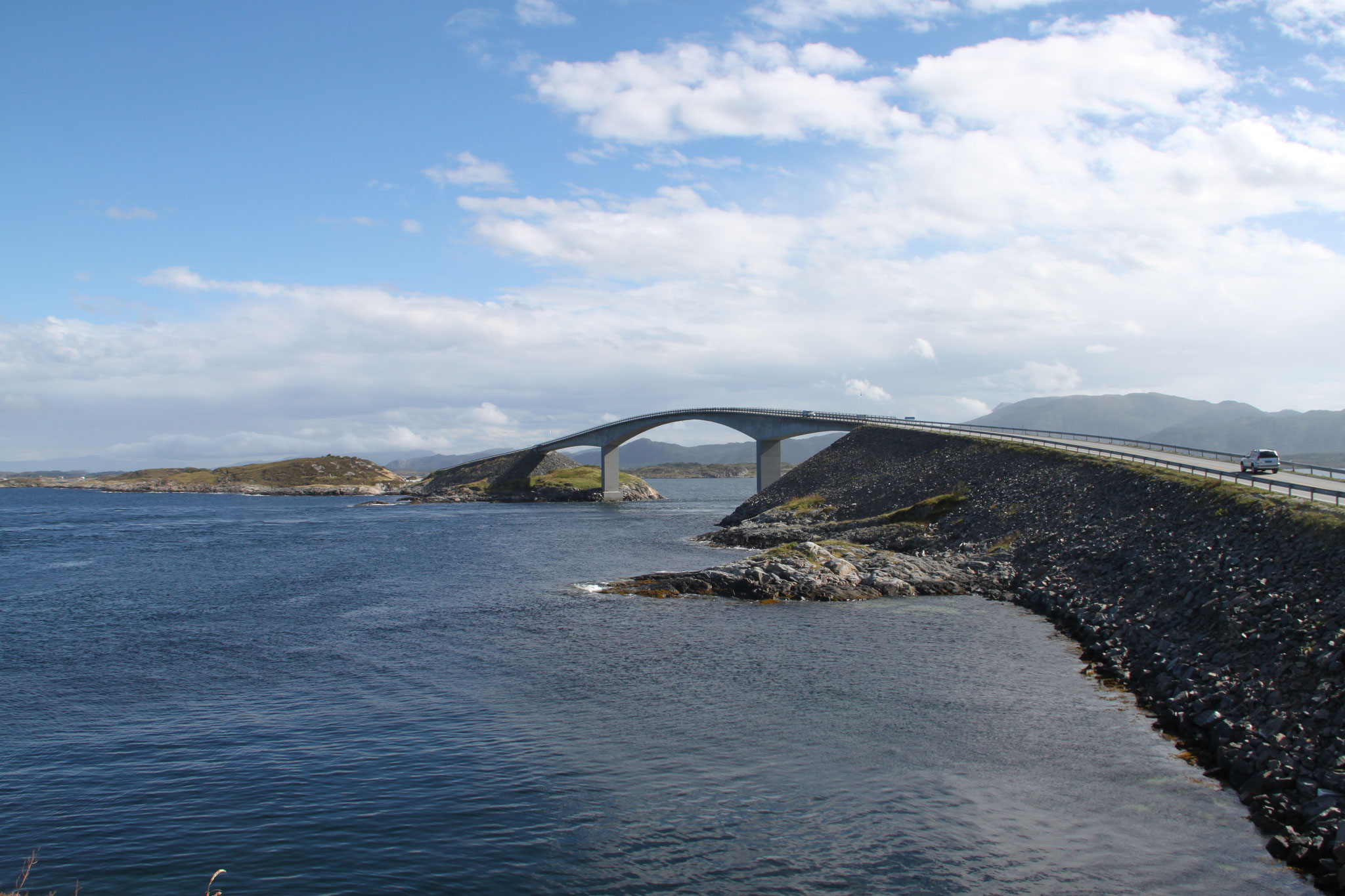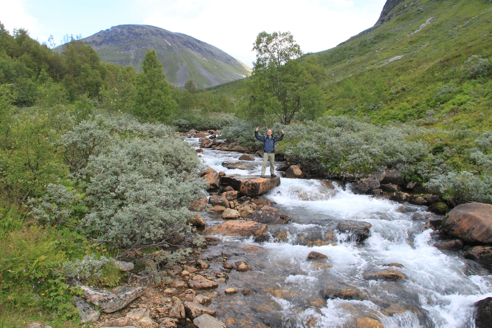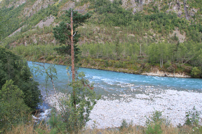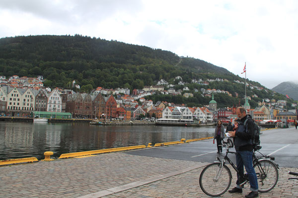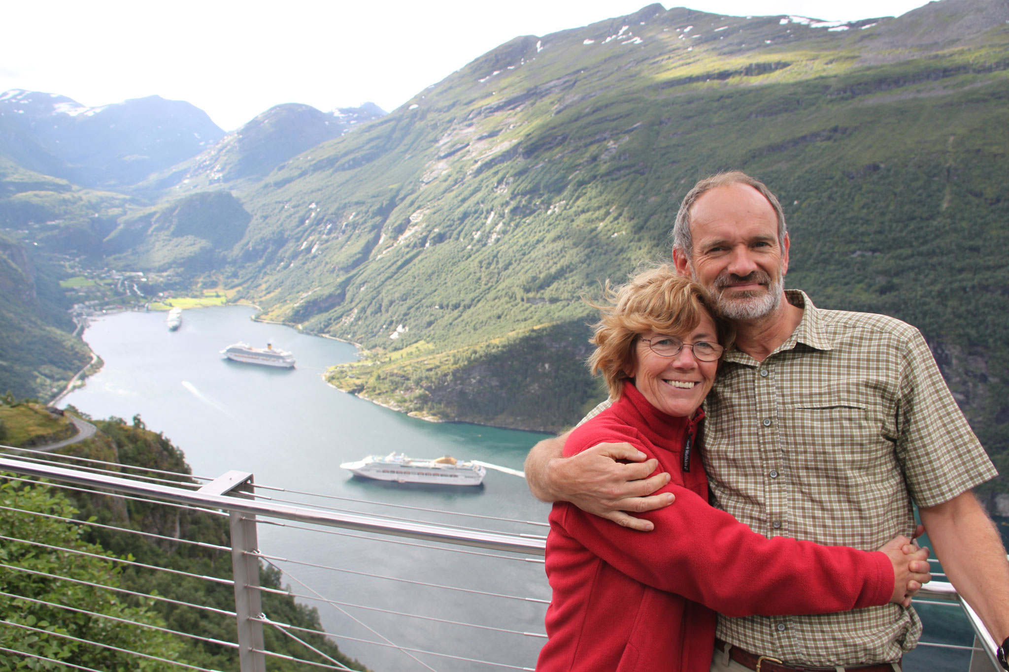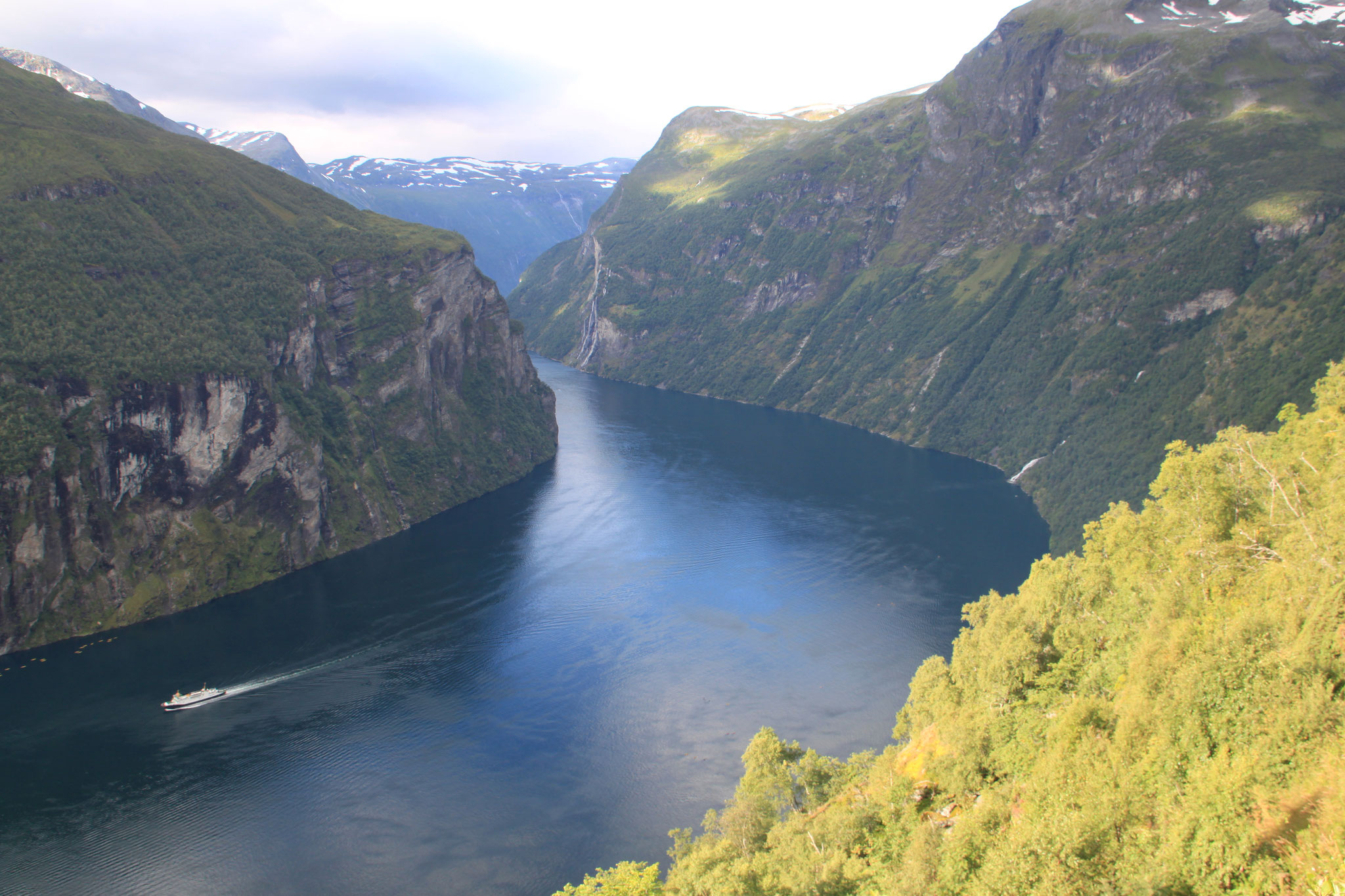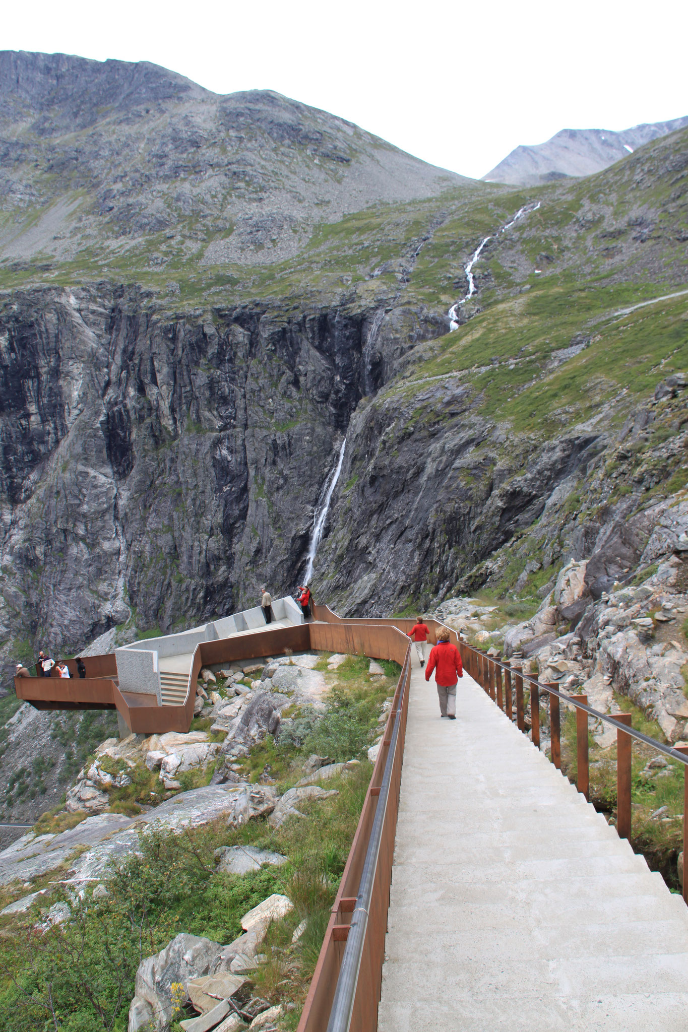 Jetzt geht es weiter zum Trollstigen. Der Trollstigen ist die Strasse nach Geiranger mit 11 Haarnadelkurven, steilen Schluchten und imposanten Aussichten. Auf halber Strecke zur Passhöhe führt eine Natursteinbrücke über den eindrucksvollen Stigfossen. Jede Haarnadelkurve trägt einen eigenen Namen. Die meisten Kurven sind nach dem Vorarbeiter des Arbeitstrupps benannt. Zum Teil ist die Fahrt hier ein richtiges Nevenkitzel. Hier haben wir auch einen Radfahrer getroffen, der auf dem Weg zum Nordkap war, er kam aus Ungarn.