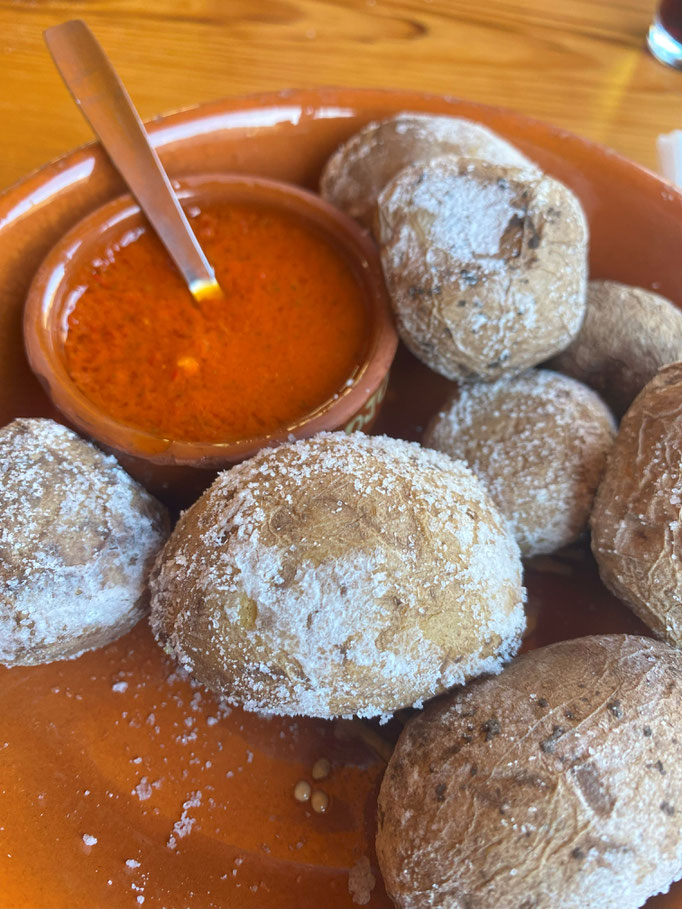 Hier haben wir Papas arrugadas , runzelige Kartoffeln mit Salzkruste gegessen. Dazu wird Mojo verde und mojo rojo serviert, zwei typisch kanarische Saucen.