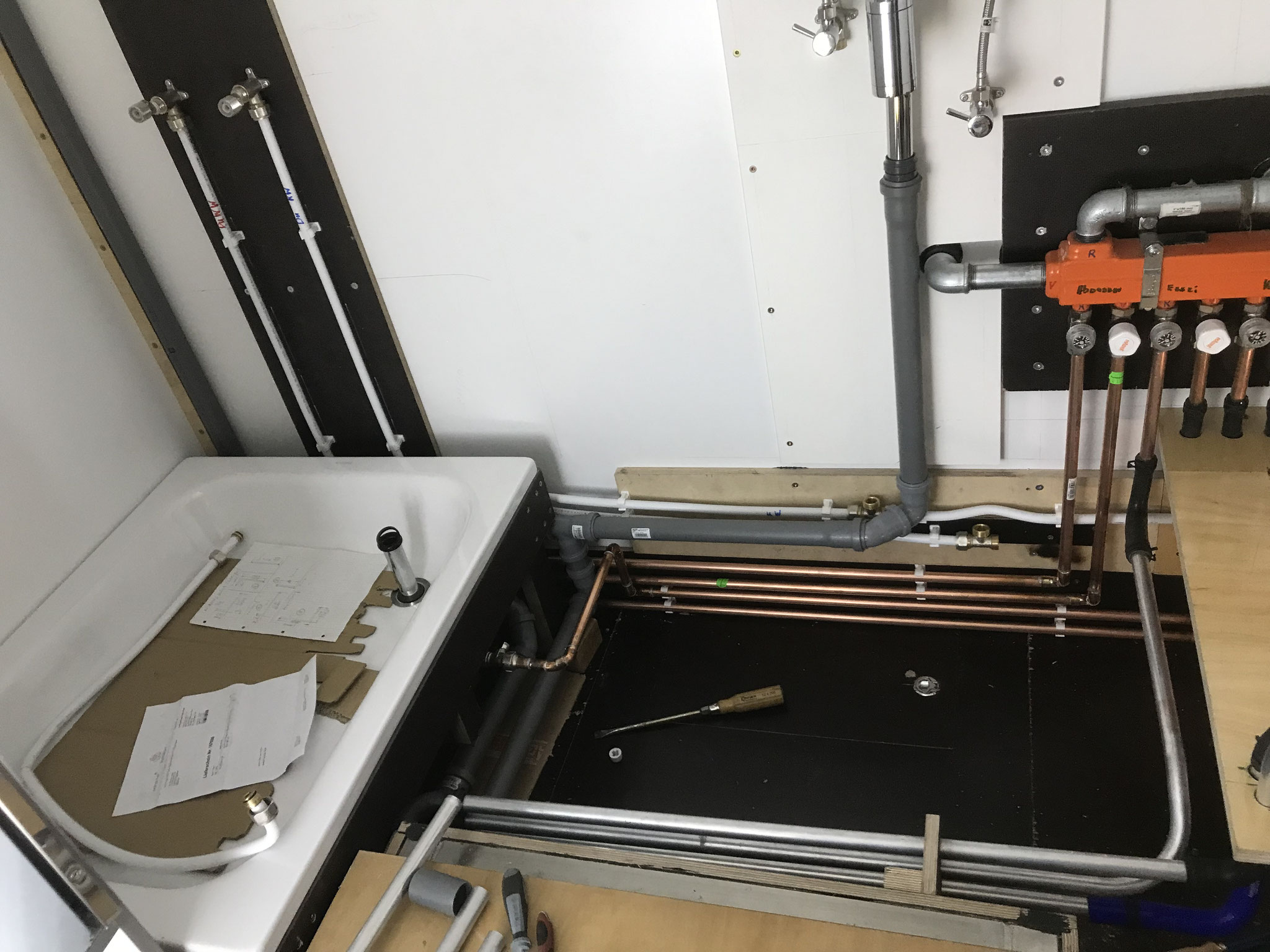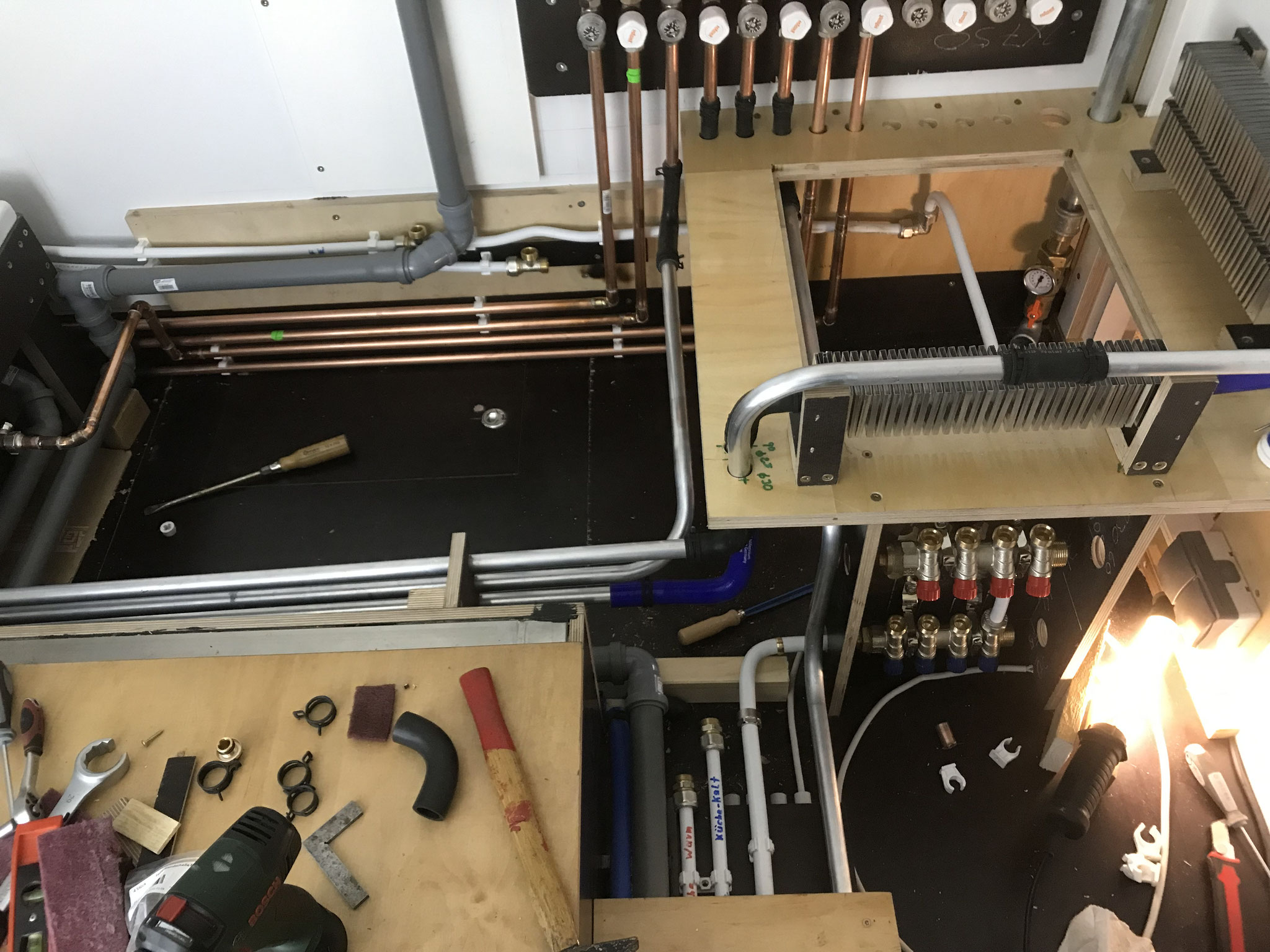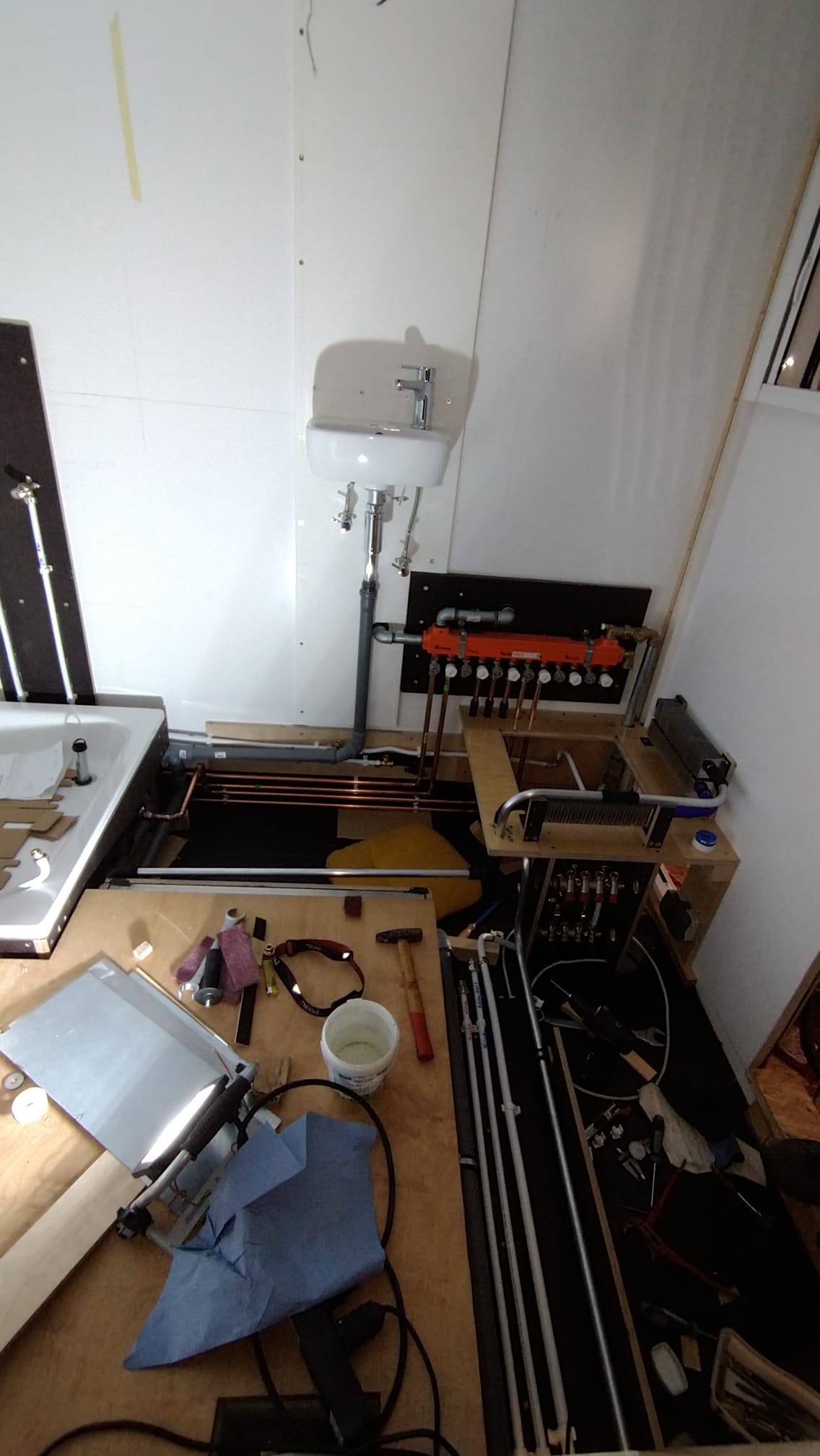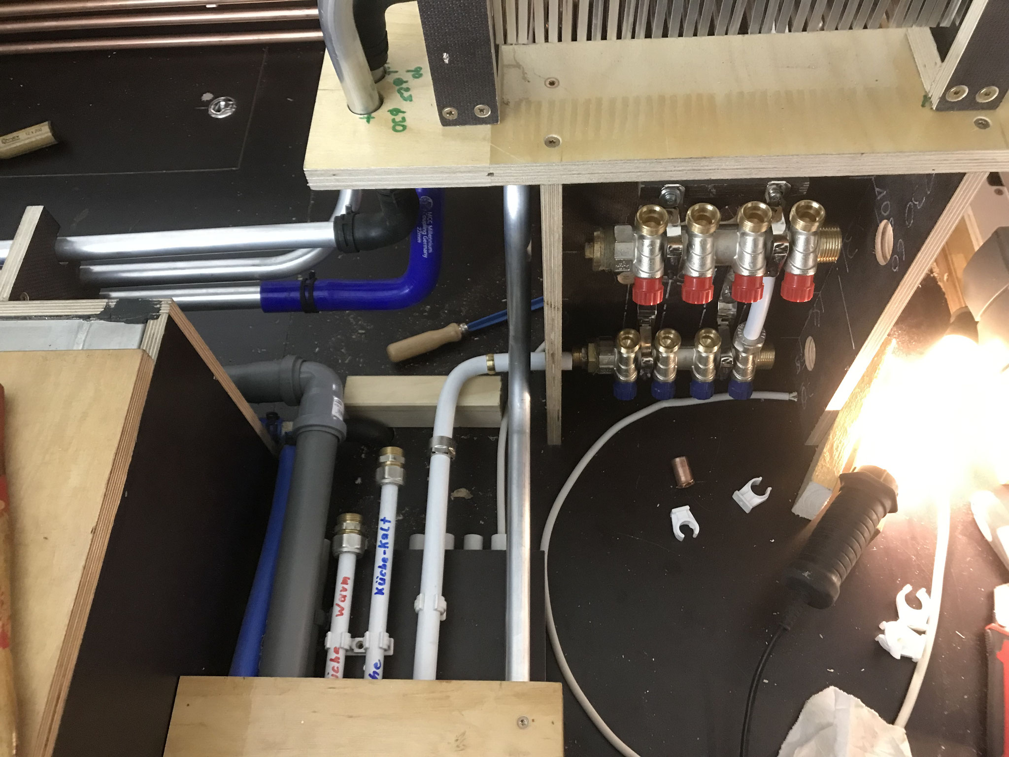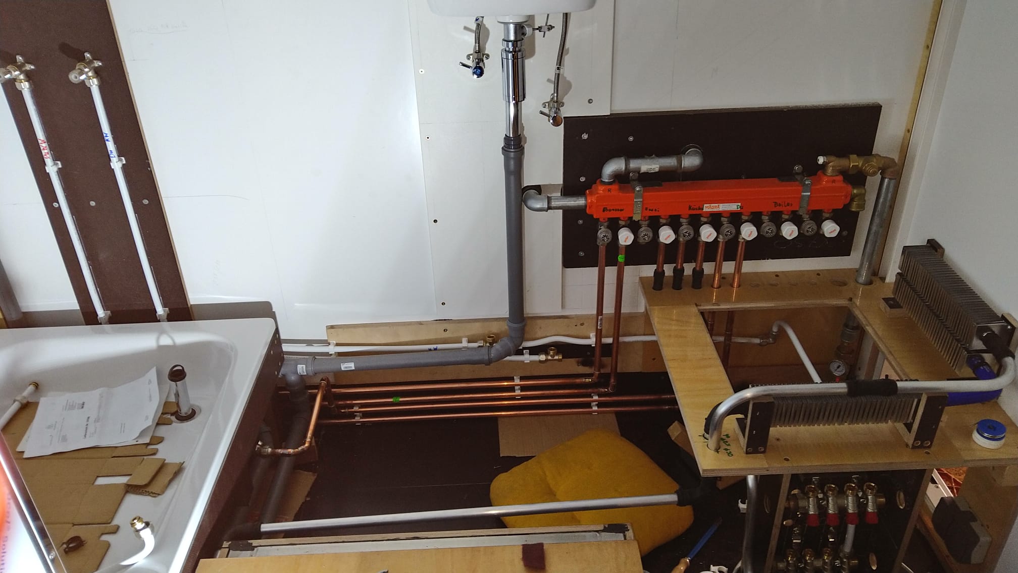 März 2023: Manfred hat nun die Wasserkreisläufe (Frischwasser/Schmutzwasser) und Heizkreisläufe installiert