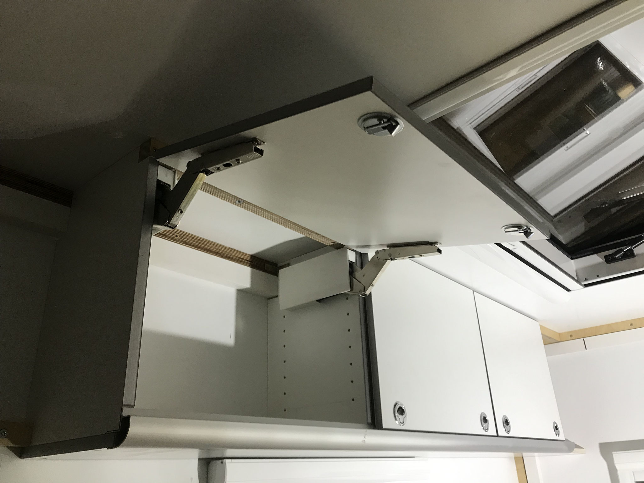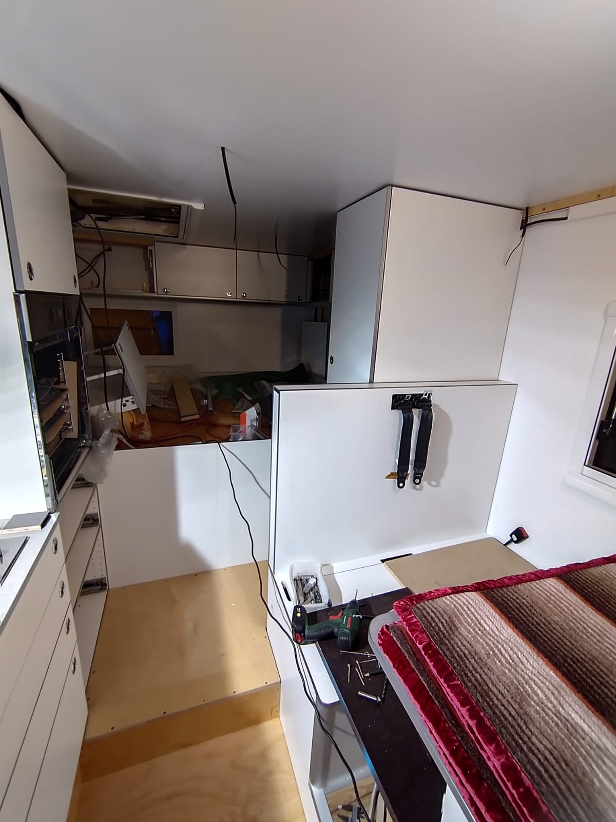 Das Bett ist fertig. Die Gurtbänke sind fest installiert und wir beginnen, die Hängeschränke zu montieren